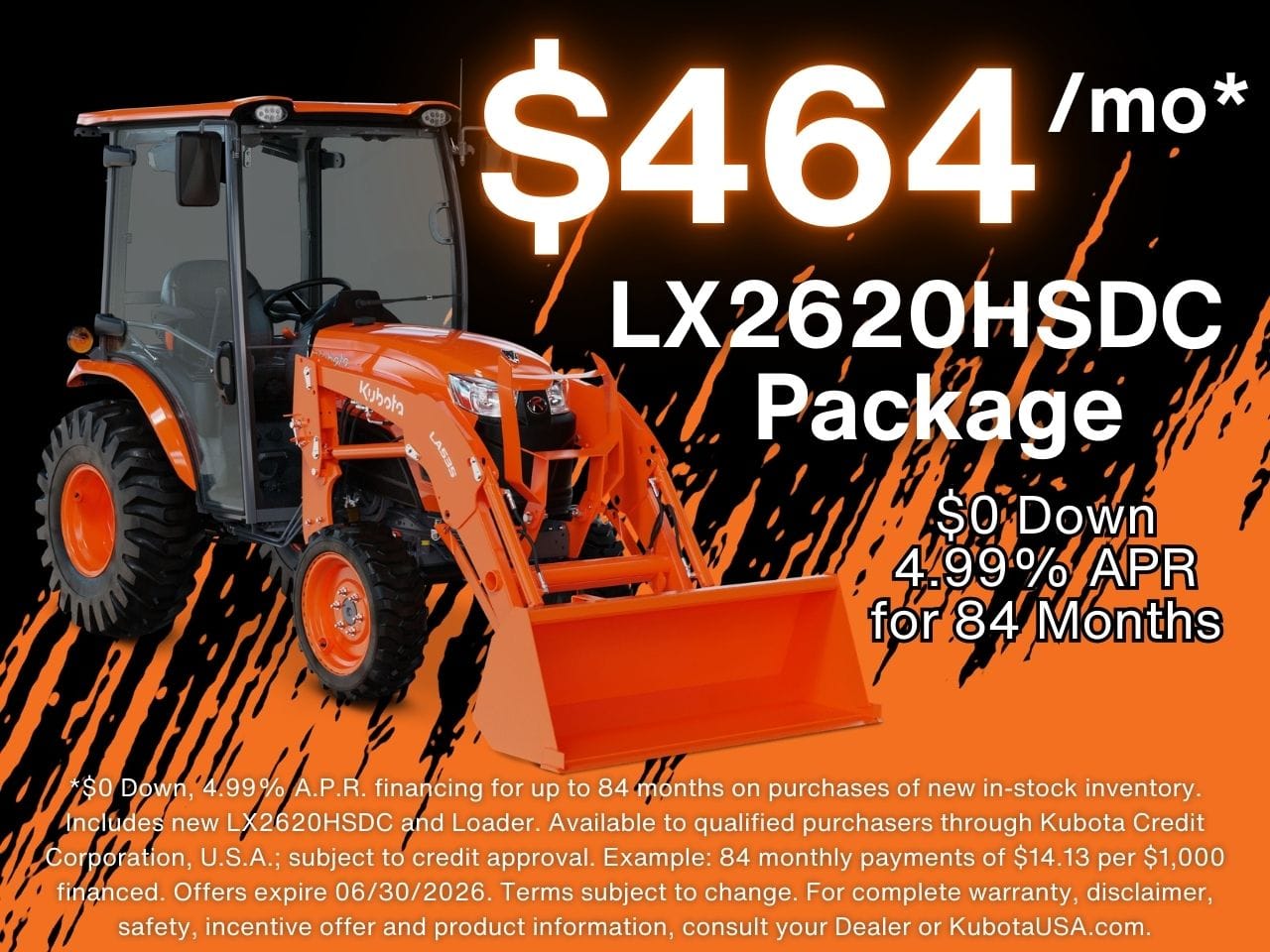 *$0 Down, 4.99% A.P.R. financing for up to 84 months on purchases of new in-stock inventory. Includes new LX2620HSDC and Loader. Available to qualified purchasers through Kubota Credit Corporation, U.S.A.; subject to credit approval. Example: 84 monthly payments of $14.13 per $1,000 financed. Offers expire 06/30/2026. Terms subject to change. For complete warranty, disclaimer, safety, incentive offer and product information, consult your Dealer or KubotaUSA.com. Image is representative and not exact.
